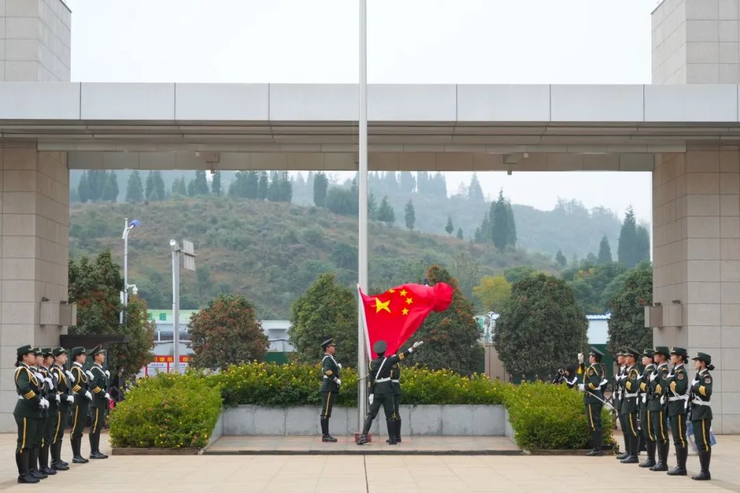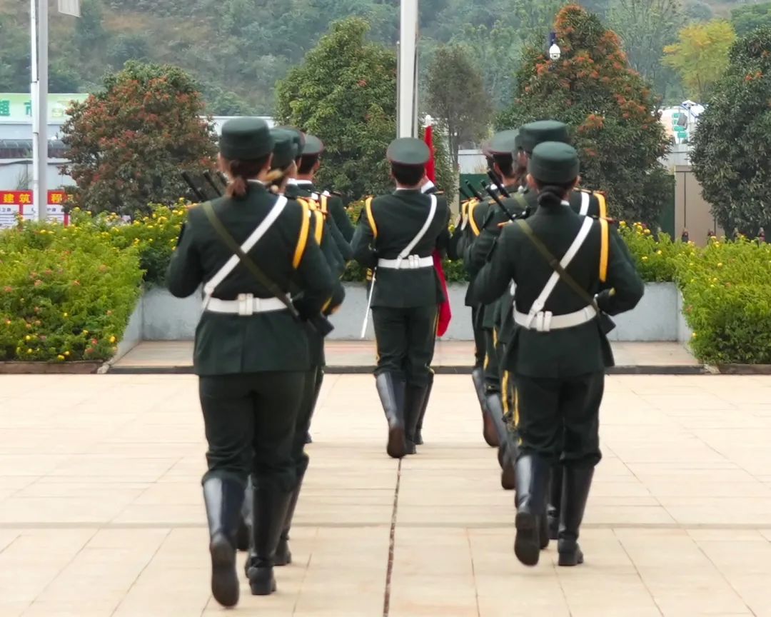 在晨曦中,国旗护卫队成员身着礼服,迈着整齐的步伐,护送国旗至旗杆前。他们身姿挺拔,眼神坚毅,展现作为青年良好的精神风貌。全体在场同学保持肃穆,以立正姿态对缓缓而来国旗行注目礼。